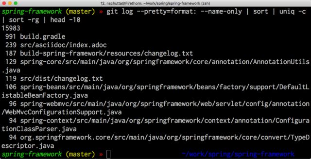 但您不应该完全依赖感觉。我们可以使用源代码管理系统来查看代码的“热图(heat map)”。以Git存储库为例,可以使用常用的Linux工具,通过几个命令行选项来运行Git日志。我们可以使用类似如下的命令生成提交次数最多的“前十个文件列表”: