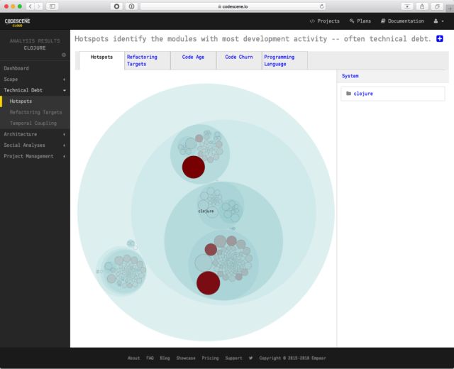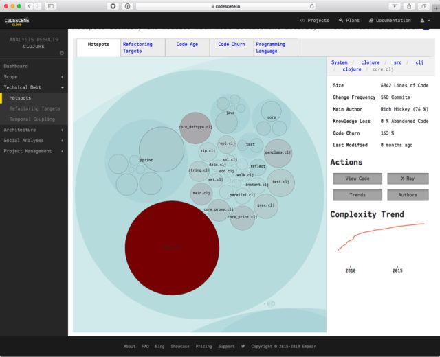 我们还可以利用全新的“代码鉴定”工具(比如CodeScene)深入了解项目。CodeScene可以识别代码中的热点,帮助我们找出不易维护的区域。借助这些结果,我们还能发现应用中可能因指定开发人员离去而会面临风险的部分。