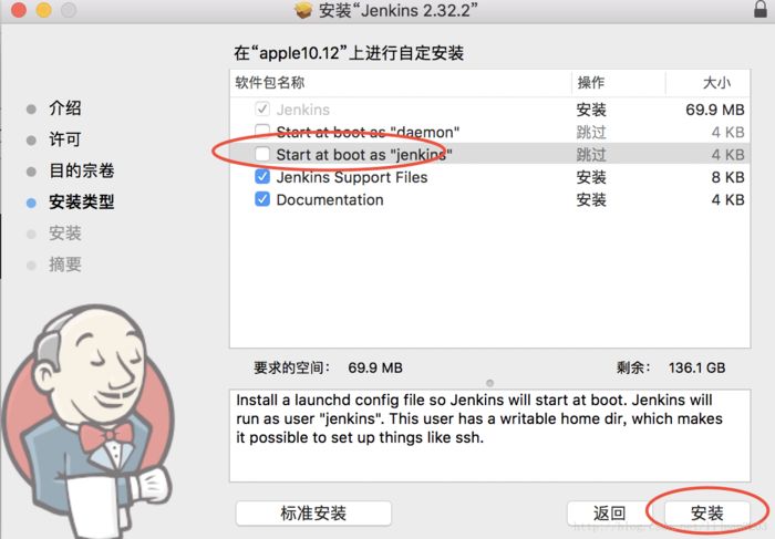 自定义安装,此时应该取消Start at boot as “jenkins”勾选,如下图: