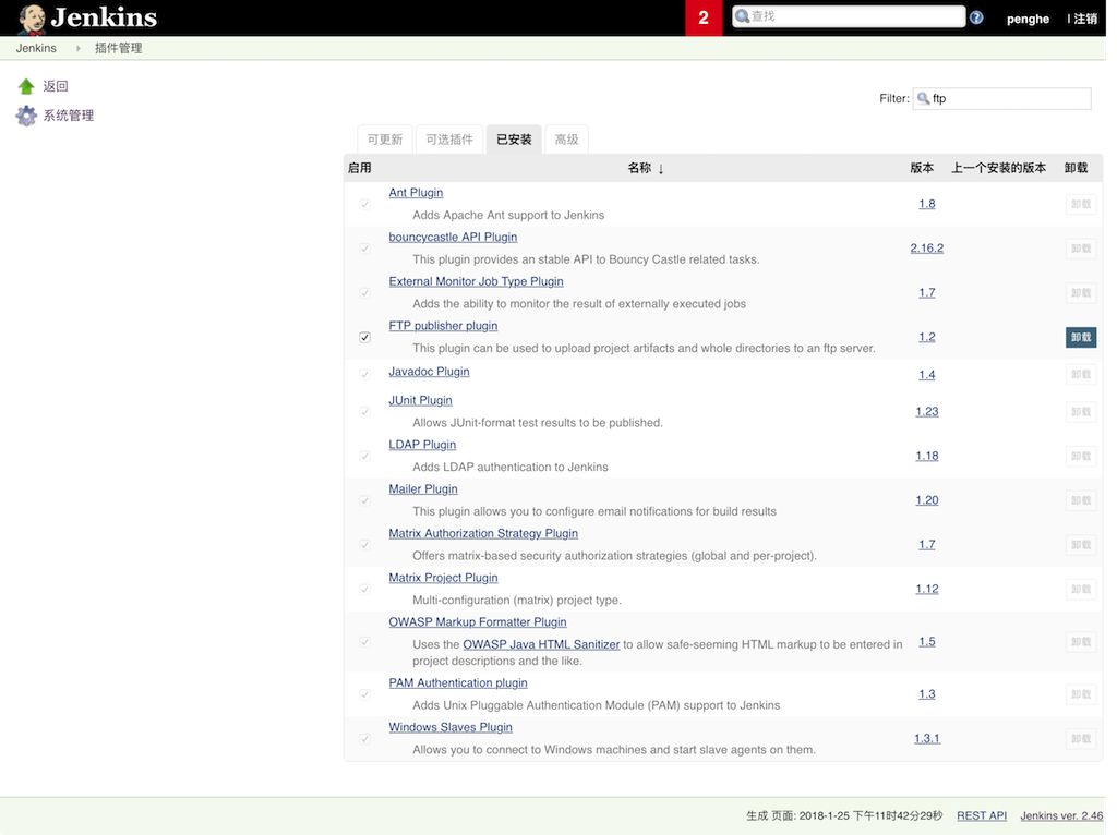 FTP publisher plugin我们需要依次选择 系统管理->管理插件,在“可选插件”中选中“Keychains and Provisioning Profiles Management”和“FTP publisher plugin”这两项,然后安装。如图,