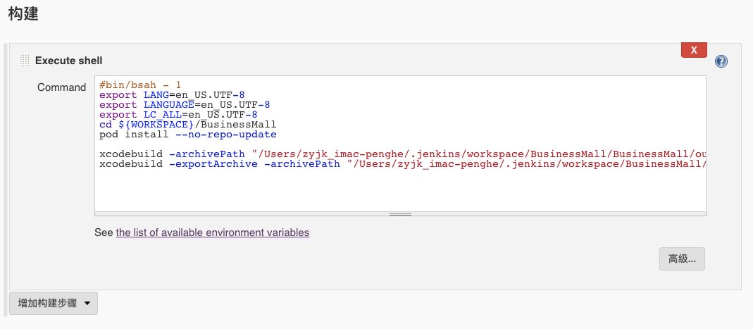 点击”增加构建步骤”选项,因为我使用的是CocoaPods管理的第三方,打包前先运行pod install –verbose –no-repo-update安装下第三方库。