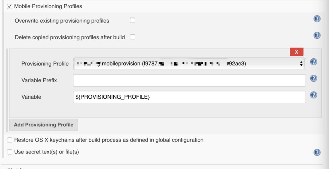 这里的Code Signing Identity和Provisioning Profile选项中对应上文Keychains and Provisioning Profiles Management插件中导入的钥匙串文件中的证书及证书的配置文件。当然也可以不勾选Mobile Provisioning Profiles。