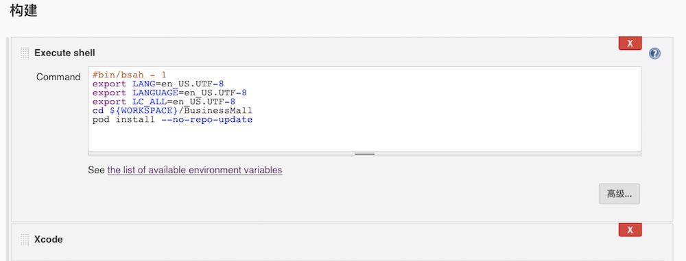 具体的解决方式是: 自己动手写脚本替代插件(插件本质是帮助我们生成打包脚本代码)。于是,在JenKins里,点击项目的”配置“选项,在”构建“中,添加xcodebuild -archivePath,xcodebuild -exportArchive -archivePath的脚本命令,输出ipa包。如图: