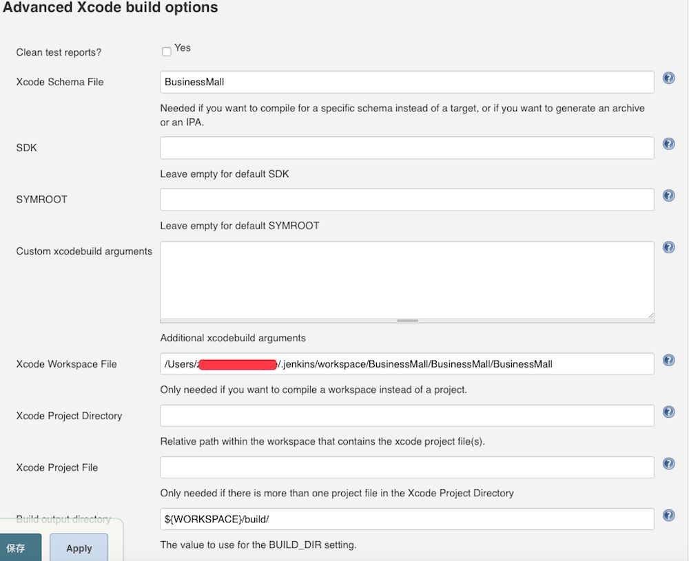 注意:Xcode Workspace File为绝对路径,也就是Jenkins用于构建项目的workspace目录中,.xcworkspace文件所在目录的路径。