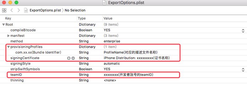 手写ExportOptions.plist文件过于麻烦,不如让XCode帮我们生成。使用XCode 9打包并导出后的文件夹里就有这样一份文件可以直接拿过来用。修改后的plist文件,如图: