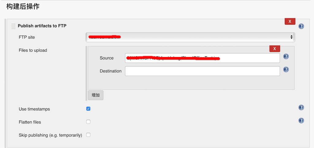 如图,选择“Publish artiffacts to FTP”,其中,FTP site就是在系统管理->系统设置中,增加的一项名为“FTP repository hosts”的配置里已经设置好的host和端口。Source为构建生成的ipa包的存放路径。