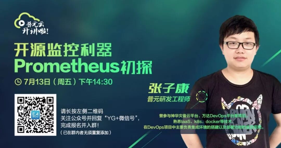 课程预告! 7 月13日(本周五)下午14:30 普元研发工程师张子康为大家分享《开源监控利器Prometheus初探》,回复此公众 号“YG+微信号”马上入群!