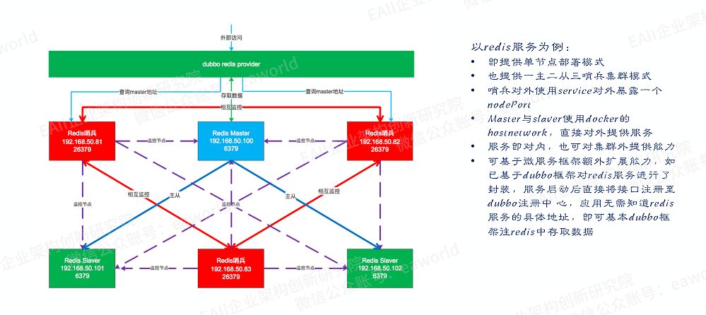 6. 容器云平台提供的基础服务,我们提供集群化的部署方案。以redis为例,我们采用的是一主二从三哨兵的部署模式。