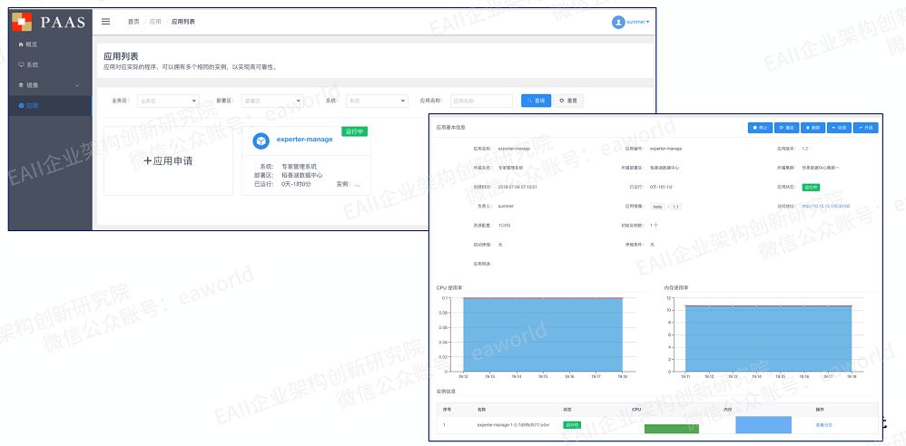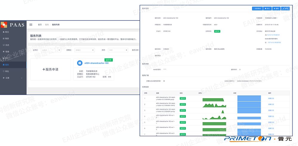 c. 服务管理模块。 服务详情页面中,可以实时看到各个实例的cpu与内存状态,可以看到他们对外提供的访问点。