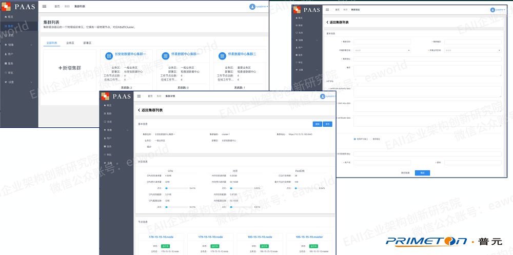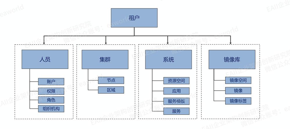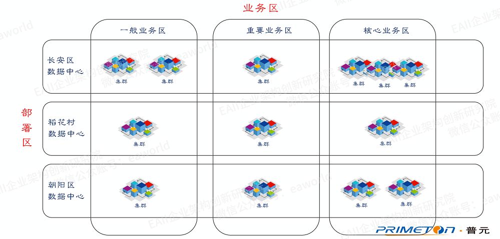 3. 集群之上,我们有区域的概念。 但这个区域,我们将它们细分成了两类,业务区与部署区。每一个集群,必须同时设置业务区与部署区。不同重要等级的业务系统,我们建议通过搭建不同的集群进行物理隔离。不同的集群可能通过采用不同级别的硬件配置及高可靠配置,来达到不同的保障级别。业务区与部署区的二维度设计,更利于企业对集群进行整体规划。