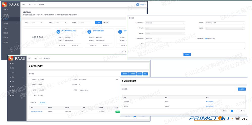 b. 系统管理模块。 创建系统的时候,需要选择它所在的业务区与部署区。业务区只能选择一个,但部署区可以选择多个(参考前面的概念模型),系统中的应用与服务,可以部署在不同的集群之中。系统有系统成员的概念,只有为此系统成员的用户,才可以在自己的面板中看到这个系统,在此系统中创建应用与服务。