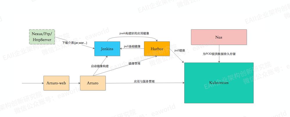 这是目前我们容器云的一个部署关系图。平台本身的管理中心arturo是前后端分离的。Harbor做为镜像仓库,k8s做为部署的载体,由Nas通过nfs协议为pod提供持久存储。我们还集成有jenkins,可以提供从介质至应用镜像的构建能力。