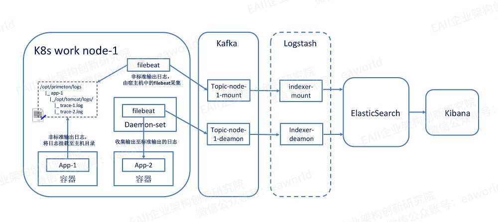 标准输出采用deamonset中的filebeat进行采集,进入kafka中以Topic-主机名-deamon的topic中。非标准输出,则需要先将容器内部的日志挂载至主机某一目录之中,然后由运行在宿主机上的filebeat进行采集,进入kafka中以 topic-主机名-mount为名的topic之中。