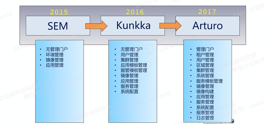 当时的SEM只是一个小模块,没有管理门户,也无需用户,配置等模板,只有最简单的容器部署能力。到了2016年,公司加大了对DevOps产品的投入力度。容器云需要做为DevOps的其中一个部署环境,为此我们开启了第二版(内部名为kunkka)的研发。这次在原有基础上加了模板相关的管理等,也有自己的用户,设置等,但仍然没有门户。