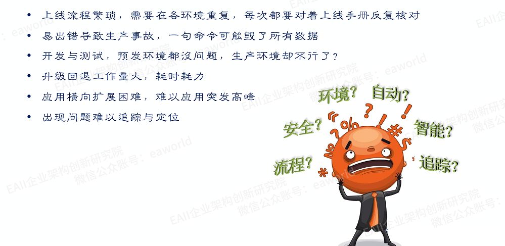 流程: 有过传统项目实施经验的同学都知道,原来要上一个项目,一般企业都有很严格的上线流程。首先开发要出一个很长的上线手册。先是测试环境,再是预发环境,特别是到了生产环境,需要对着手册反复核对,谨慎操作。一个项目上线下来,心力交瘁。