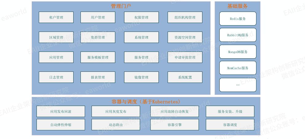 为什么我们要把基础服务单独列出来呢? 因为我们认为,容器云平台如果仅仅提供应用的部署,那就有点大材小用了,他有着隐藏的PAAS特性。现在一般的分布式应用,或多或少都会用到一些中间件,如果容器云能化身为一个PAAS平台,可以方便地提供这些稳定的中间件服务,将会大大简化应用的部署。