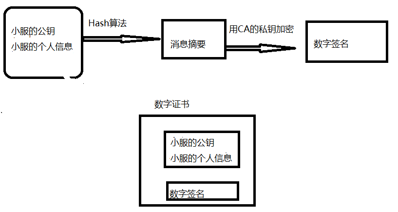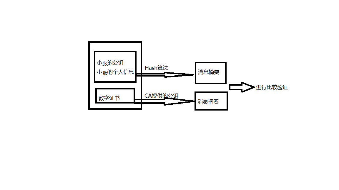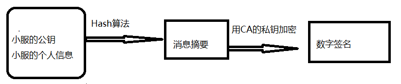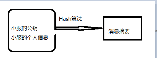 小服再给小客发公钥的过程中,会把公钥以及小服的个人信息通过Hash算法生成消息摘要。如图: