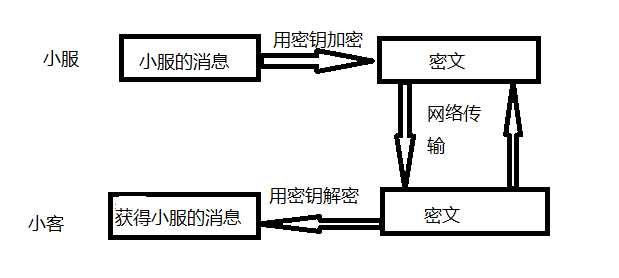 在每次数据传输之前,小服会先传输小客一把密钥,然后小服在之后给小客发消息的过程中,会用这把密钥对这些消息进行加密。小客在收到这些消息后,会用之前小服给的那把密钥对这些消息进行解密,这样,小客就能得到密文里面真正的数据了。如果小客要给小服发消息,也同样用这把密钥来对消息进行加密,小服收到后也用这把密钥进行解密。 这样,就保证了数据传输的安全性。如图所示: