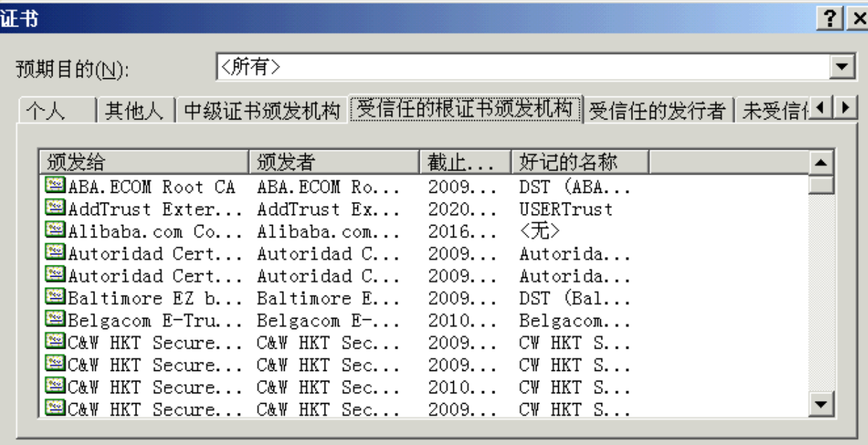 这时可能有人会有疑问,CA的公钥是怎么拿给小客的呢?小服又怎么有CA的私钥呢?其实,(有些)服务器在一开始就向认证中心申请了这些证书,而客户端里,也会内置这些证书。如图(此图来元阮一峰的网络日志)