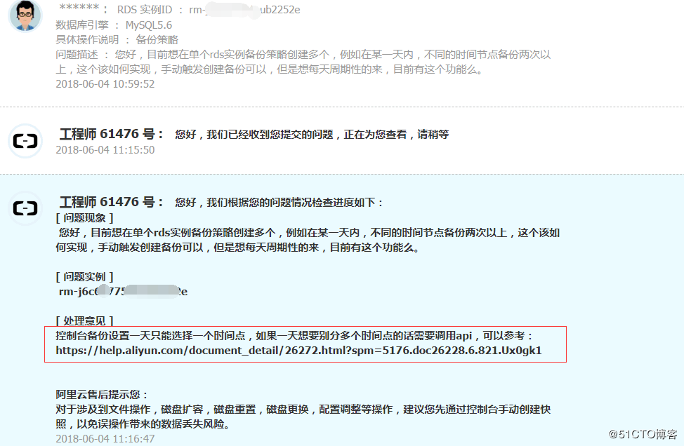 举一反三,类似的可以参考阿里云rds的API完成其他需求,如何客户对应rds的备份频率很高的话,可以开通灾备实例,来完成异地的实时备份,如果横向扩展读写操作,可以开通多个只读实例来分摊数据库压力。
