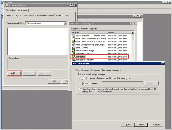 - 启动控制台程序,选择菜单“文件"中的"添加/删除管理单元”-> “添加”,从“可用的独立管理单元”列表中选择“证书”-> 选择“计算机帐户“