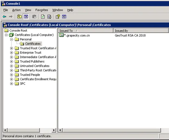 - 在控制台的左侧显示证书树形列表,选择“个人”->“证书”,右键单击,选择“所有任务"-〉"导入”, 根据"证书导入向导”的提示,导入PFX文件(此过程当中有一步非常重要: “根据证书内容自动选择存储区”)
