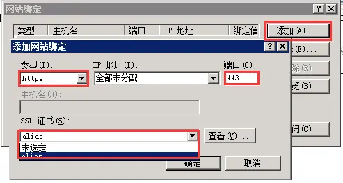 - 为站点分配证书,选择“绑定”->“添加”->“类型选择 https” ->“端口 443” ->“ssl 证书(选择导入的证书名称)” ->“确定”