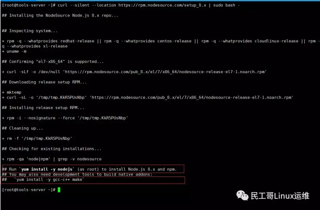 [root@tools-server ~]# curl --silent --location https://rpm.nodesource.com/setup_8.x | sudo bash -