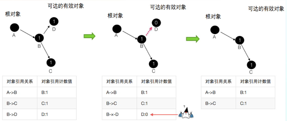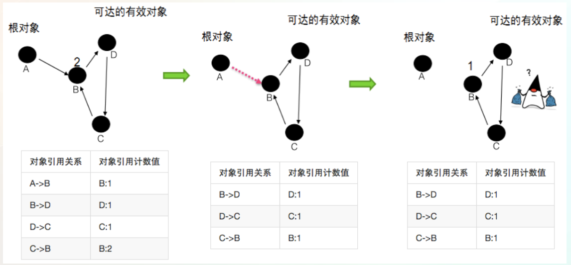 下图中左图是对象的引用关系,中图有一个引用失效,右图是清理引用计数器=0的对象后。
