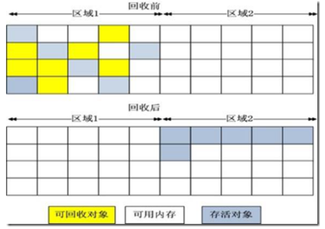 在标记-清除算法上做的简单优化,主要思路是:将可用内存分为相等大小的两份(活动区间和空闲区间),每次只使用其中的一份(活动区间)。在进行GC的时候,首先将活动区间的存活对象依次复制到空闲区间,然后再全量清除活动区间即可。每次GC之后,活动区间和空闲区间就会交换过来。