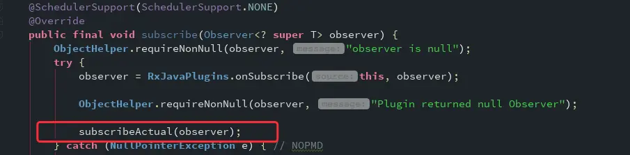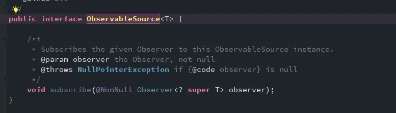 ObservableSource 接口就一个方法 subscribe,参数接收一个Observer,所以使用的时候,就是通过subscribe方法注册观察者。下面是RxJava的实现:
