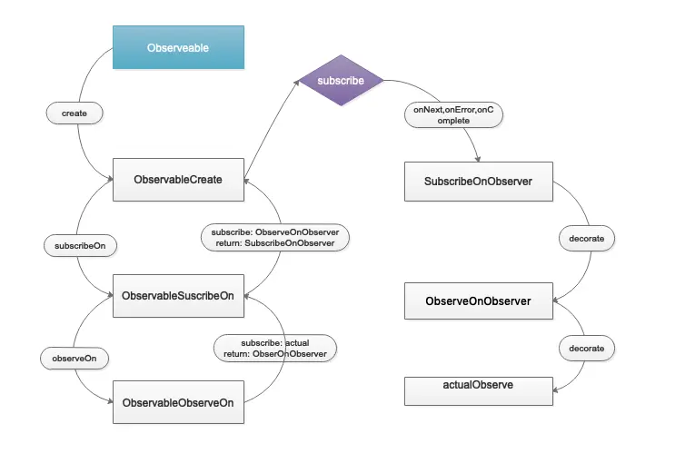 - Observerable.subscribeOn(Scheduler scheduler), 创建一个ObservableSubscribeOn对象,继承于Observable,它的subscribeActual方法实现:新建一个SuscribeOnObserver对象装饰原有的Observer,然后将新的Observer封装到SubscribeTask对象中(一个Runnable), 然后扔给scheduler调度