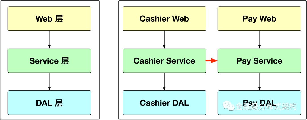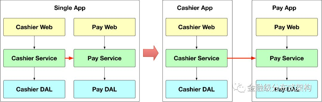 当这个系统承载的业务变多了之后,系统可能演化成上图中右边的这种方式。在上图的右边的部分中,一个系统承载了两个业务,一个是 Cashier(收银台),另一个是 Pay(支付),这两个业务可能会有一些依赖的关系,Cashier 需要调用 Pay 提供的能力去做支付。
