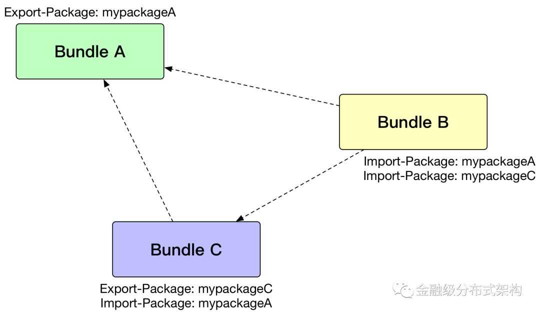 OSGi 通过扩展 Java 的 ClassLoader 机制,将模块和模块之间的类完全隔离开来,当一个模块需要引用另一个模块的类的时候,通过在模块中的 MANIFEST.MF 文件中声明类的导出和导入来解决,如下图所示: