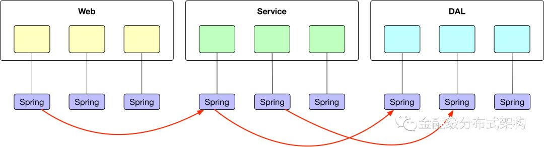 在一个简单的 Spring/SpringBoot 的系统中,我们常常见到一个系统中的模块会按照如下的方式进行分层,如下图中的左边部分所示,一个系统就简单地分为 Web 层、Service 层、DAL 层。