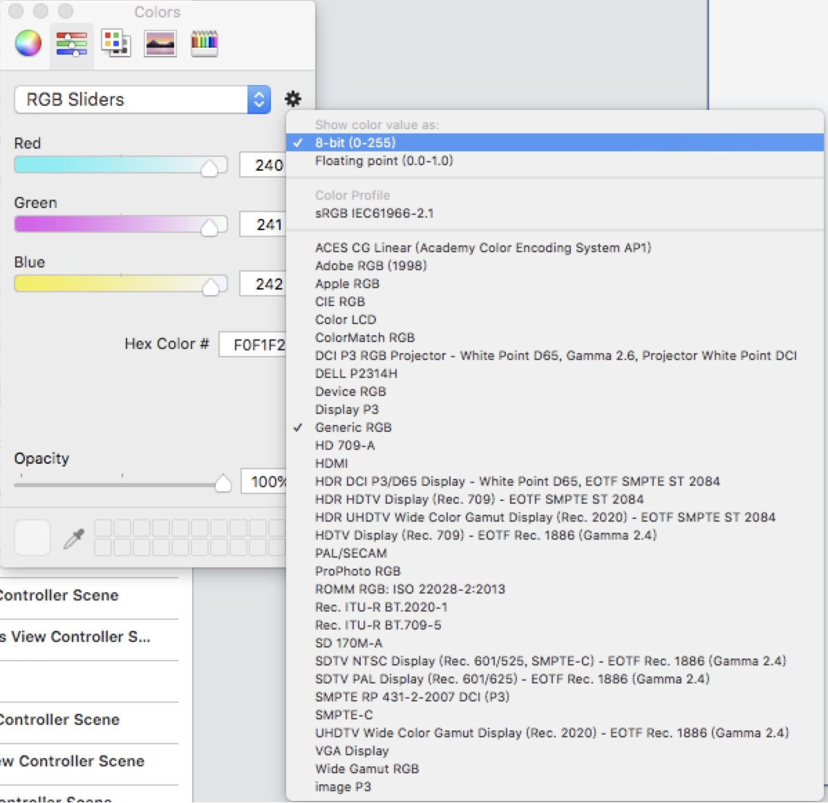 今天分享一下 Xcode Interface Builder 设置背景色的一个坑。从 Xcode8 起,Xib/Storyboard 里的颜色空间默认从 Generic RGB 换成了 sRGB,但又不是所有的都会转换,很奇怪。所以当时在适配 Xcode8 的时候,颜色空间都统一全局替换了一遍。最近又遇到一次这个坑,在 Storyboard 把某个视图背景色从白色更改为 0xf0f1f2,然后 run 起来,和其 superview (superview 的背景色是用代码设置的 0xf0f1f2)竟然有一个明显的分割线,所以回想起当时适配时的这个问题,然后取到 Storyboard 里面一看,果然是颜色空间被莫名改为了 Generic RGB,如图所示。所以手动改变其颜色空间为 sRGB 即可。
