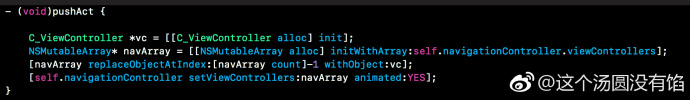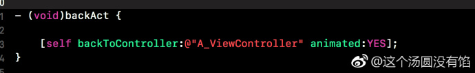 方法三:写一个UIViewController的catrgory,方法实现如图二。在C的backAct方法中使用,如图三。有的同学可能会怀疑B会不会内存泄露,可以在B中打印dealloc。