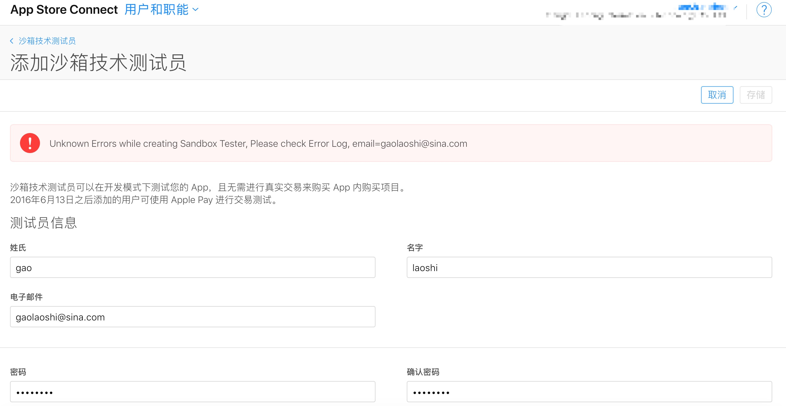 在测试 IAP 的时候需要添加沙箱技术测试员,相当于创建一个虚拟的 AppleID,填写的邮箱是不能写真实 AppleID 邮箱的,要不然就会报错,可以随意写一个不存在的邮箱,为了方便,创建一个简短的密码就会报错误: