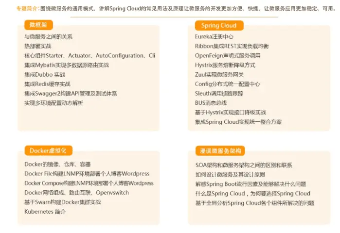 围绕微服务的通用模式,讲解spring Cloud的常见用法及原理,让微服务的开发更加方便 快捷,让微服务应用更加稳定 可用。