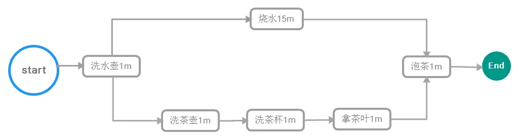 以这个流程来看,如果我们想中午12点开始烧水泡茶,那么洗水壶的「最早开始时间」需要是12点,「最早结束时间」是12点1分;烧水的「最早开始时间」需要是12点1分,「最早结束时间」是12点16分!另一条线上,洗茶壶的「最早开始时间」是12点1分,「最早结束时间」是12点2分;洗茶杯的「最早开始时间」是12点2分,「最早结束时间」是12点3分;拿茶叶的「最早开始时间」是12点3分,「最早结束时间」是12点4分!而泡茶的「最早开始时间」是12点16分(必须要等水烧好),「最早结束时间」是12点17分;喝到茶的「最早开始时间」是12点17分!