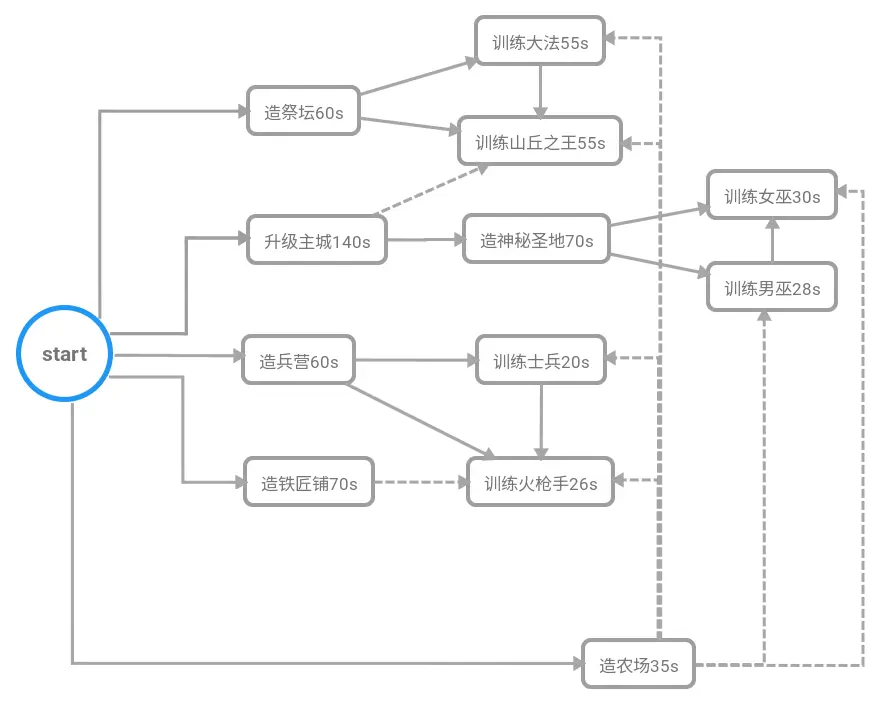 很明显,这里最耗时的任务是升级主城,耗时140s!它没有前置任务,有两个后置任务:训练山丘之王和造神秘圣地!训练山丘之王55s,造神秘圣地70秒,好像造神秘圣地比训练山丘之王耗时长。