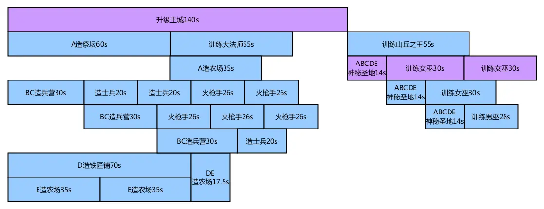 首先在升级主城的140s时间里!由于时间跨度很大,我们的组合方式就很灵活!比如说我们可以让A造祭坛60s,B和C造兵营30s,D造铁匠铺70s,E造两个农场70s!30s后兵营完成,训练两个士兵和一个火枪手,20s * 2 + 26s * 2 = 92s!为什么要这么分配呢?因为火枪手要等铁匠铺,而造好两个士兵后,正好铁匠铺完成!同时B和C再造一个兵营30s!完成后训练三个火枪手,26s * 3 = 78s!B和C再造一个兵营30s!完成后训练最后一个士兵20s!祭坛完成后,立即训练大法师,同时A去造农场!D和E造完农场后,再一起造一个农场17.5s!