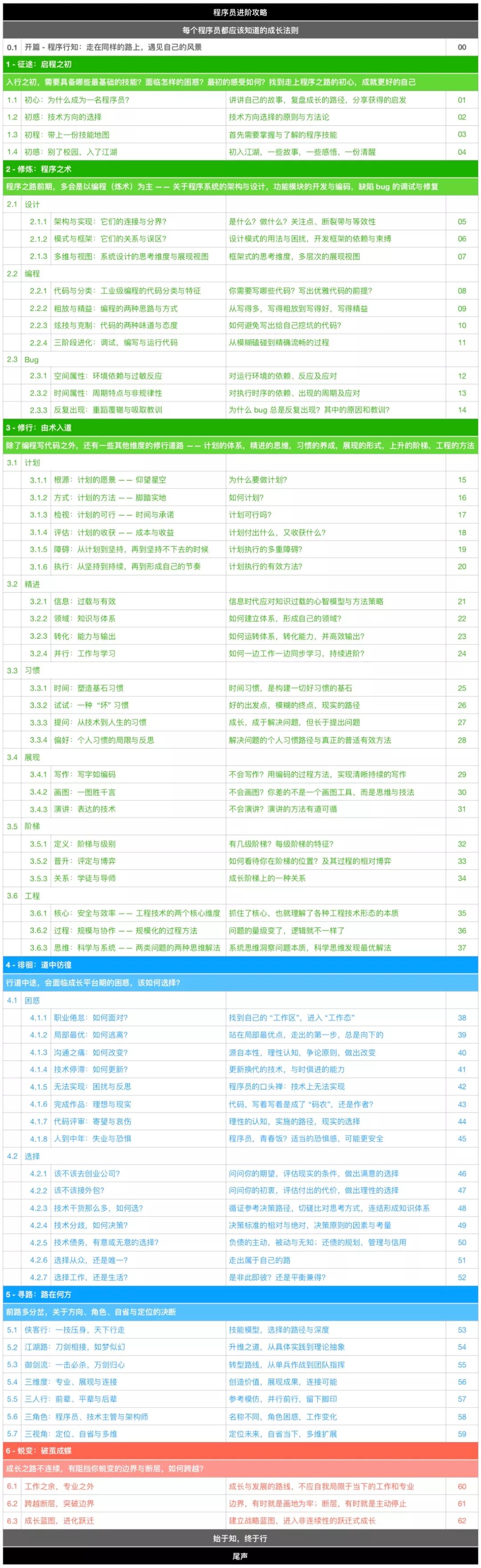 “启程之初”,是我们刚踏上程序之路面临的一些问题和感悟;“程序之术”,是我们工作早期的主要内容,以修炼编程技能为主;程序员的工作除了编程写代码,还有很多其他的内容,这是另外一个维度的修行之路,也即 “由术入道”;