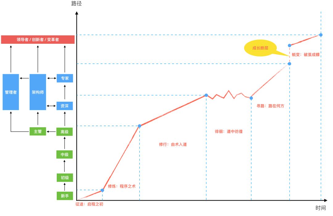 这是一条成长线的表意图,它有两个部分:图上左侧的路径,是匹配不同成长阶段,我们可能对应的不同职业角色;右侧是一条由成长不同阶段组成的成长线,包括如下: