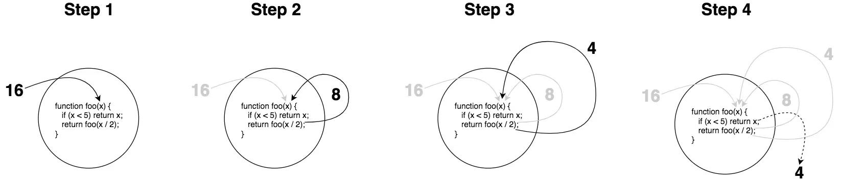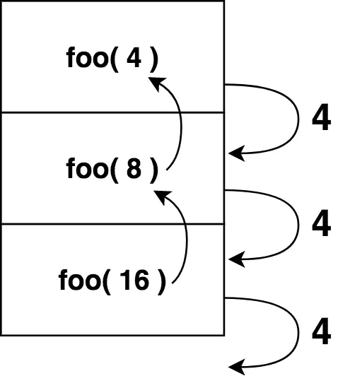 In step 2, x / 2 produces 8, and that's passed in as the argument to a recursive foo(..) call. In step 3, same thing, x / 2 produces 4, and that's passed in as the argument to yet
