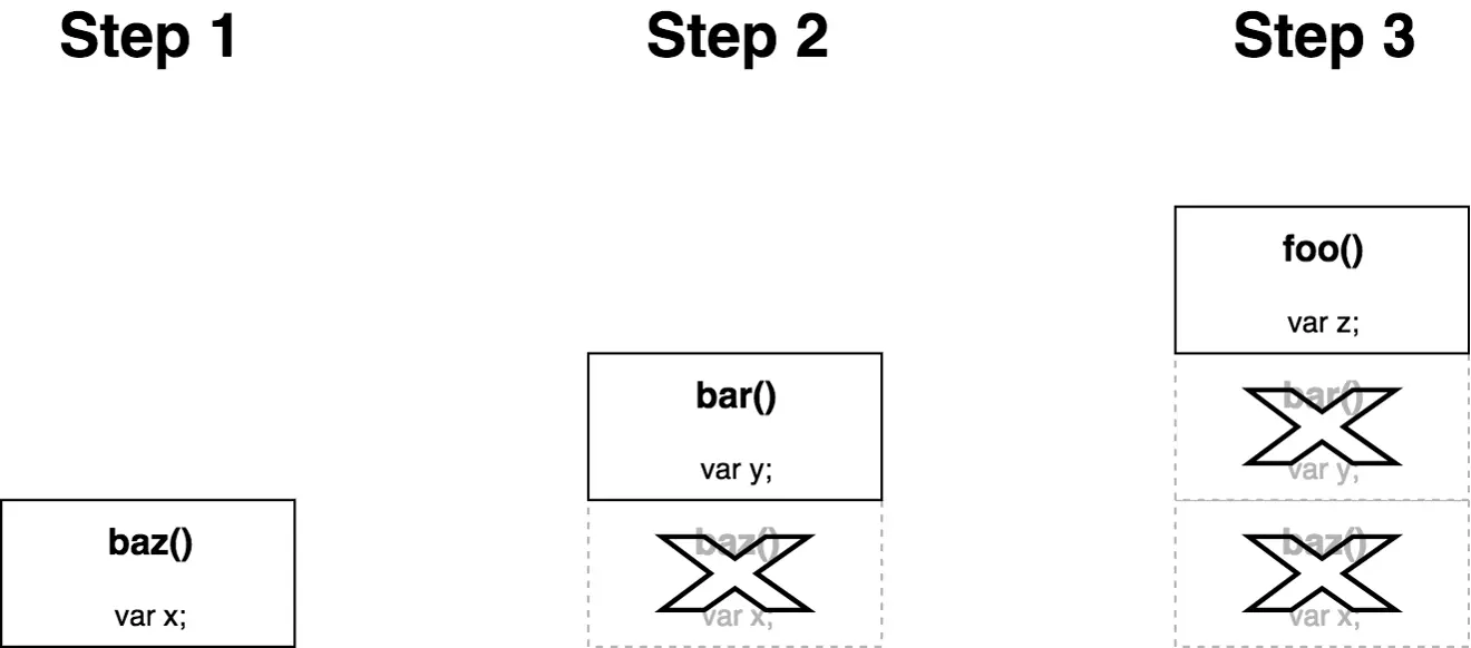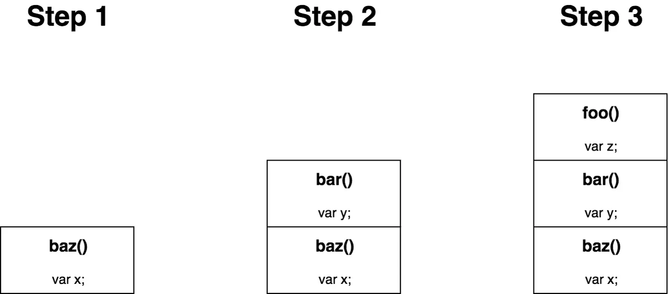 Instead of functions calling functions, the stack never goes beyond depth of one, because each function just returns the next function that should be called. A loop simply keeps running each returned function until there are no more functions to run.