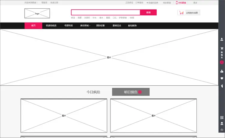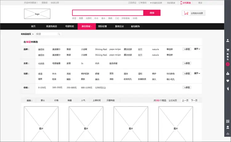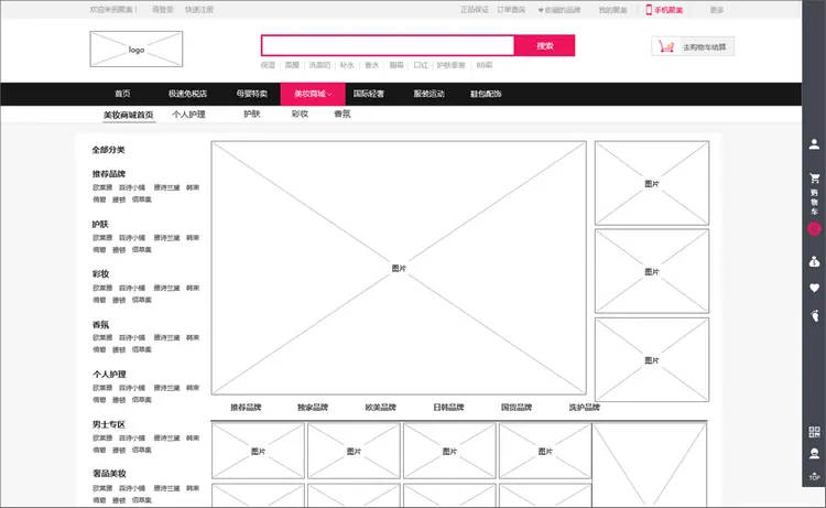 这个原型的主要页面有:首页、关键词搜索页、美妆商城页等。
