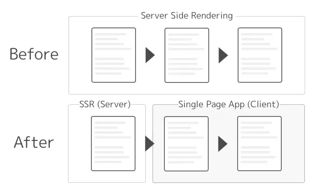 因此,为了让两者都能发挥最佳性能,我们决定在第一页使用服务器端渲染(Server-side Rendering, SSR),从第二页起使用单页面应用(Single Page Application, SPA)。这样一来,既能确保第一页的展示速度和机器可读性(Machine-Readability)(含SEO),又能获得SPA带来的快速展示速度。
