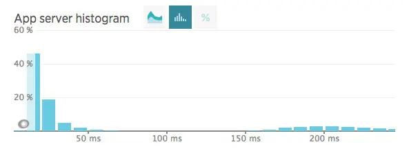 这张图是文章详细页面的统计数据。可以看出,这个页面的响应时间也基本上是在50ms以下。由于存在文章过长的时候会造成页面体积变大,以及文章页面不能完全缓存等情况,所以相比列表页面会存在更多较慢的响应。