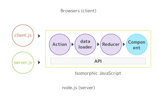 写好的JavaScript同时运行在服务器端还是客户端上的运行行为、以及从数据读取直到在页面上显示为止的整个浏程,都以相同的形式进行。